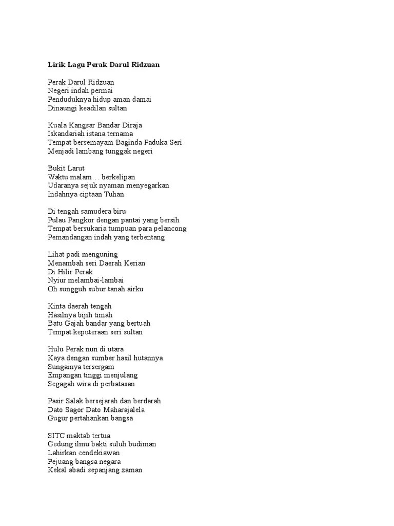 Lirik Lagu Negeri Perak / Kementerian Wilayah Persekutuan Tahukah Anda Sewaktu Kemerdekaan Negara Tidak Mempunyai Lagu Kebangsaan Oleh Itu Tunku Abdul Rahman Yang Juga Merupakan Menteri Hal Ehwal Dalam Negeri Telah Menganjurkan Pertandingan Untuk Mencari Lagu